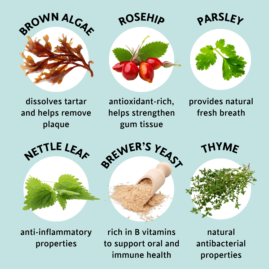Ez a természetes keverék hat különleges összetevőt tartalmaz, amelyek együtt támogatják kedvenced szájhigiéniáját: