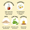 - Természetes összetevőkkel: almaecet, kamilla, aloe vera, zab, ricinusmag-olaj